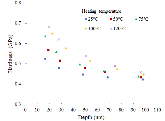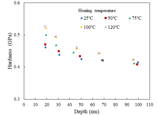 図5は,各積算光量で加熱温度を変えたときの表面から深さ方向の硬度変化を示したものである.表層付近の硬度は,いずれの積算光量でも加熱温度が高くなるほど上昇した.また,表面からの深さが大きくなるほど硬度は低下し,予め測定したハードコートの硬度の0.35 GPaに近づいた.ナノインデンテーション試験では下地の影響を受けるため,経験的に圧子の押し込み深さは膜厚の1/10 以下とすること推奨されている(9).押し込み深さ20 nm以上で硬度が急激に低下していることは,改質層が傾斜構造であり,表層付近のみが硬度が非常に高いことを示唆している.今回は,表面から深さ方向の硬度変化を近似曲線で表し,表層50 nmにおける硬度を算出し,比較することにした.