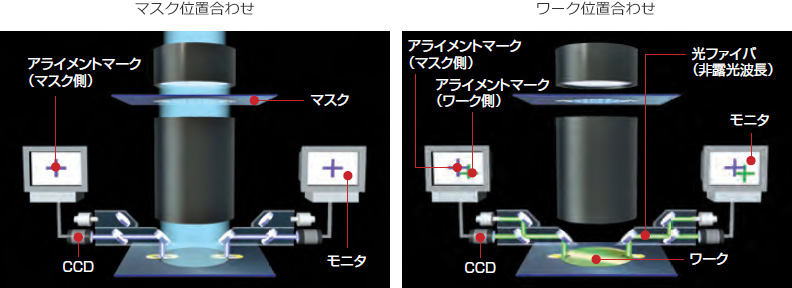 独自のTTL非露光波長アライメント方式を採用しています。これは、マスクとワークのアライメントマークを個別に検出し、各々を画像処理によってxy座標軸上に固定して位置合わせを行なう方式で、以下のような特徴を持っています。