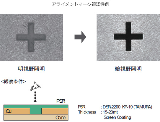 下地の影響でコントラストの低いマークでも、照明方法の選択(明視野/暗視野照明)と波長選択によって視認性を向上できます。