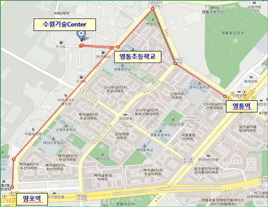 지하철 분당선 영통역 ⑥번출구 →상기 순로에 따라 도보 약20분