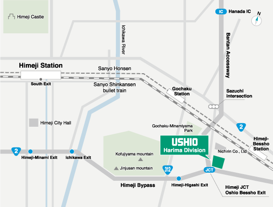 Take the Sanyo Expressway to the Sanyo Himeji-Higashi interchange, and from there take the Bantan Renraku Road toward Himeji. After passing the Hanada interchange, take the Ōshio Bessho exit at Himeji junction.