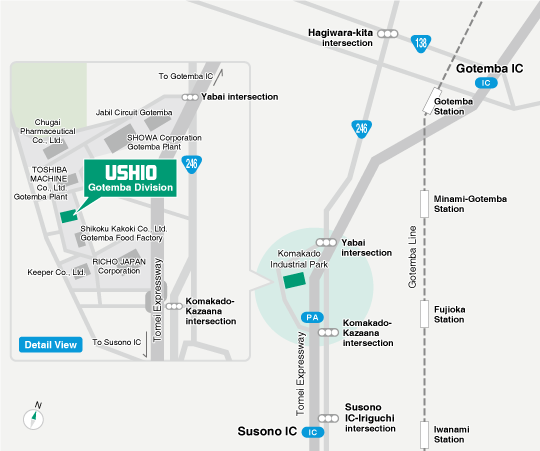 Take the Tomei Expressway, exiting at the Gotemba interchange toward Japan National Route 138 and turn left at the “Ishibashi” signal. Turn left at the “Hagiwara kita” signal onto Japan National Route 246. At the “Yabai” signal, turn right and enter the Komakado Industrial Park.