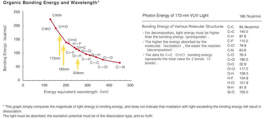 유기 물질의 분자 구조를 끊기 위해서는 물질의 결합 에너지를 뛰어넘는 빛의 에너지를 필요로 합니다. 물질의 에너지 흡수(여자)가 크면 클수록 반응(분해)을 유도하기가 쉽고 요구되는 처리 시간도 짧아집니다. 저전압의 UV 램프로 끊어낼 수 없는 결합 에너지는 엑시머 램프에서 생성되는 172nm 파장을 이용해 해결할 수 있습니다.