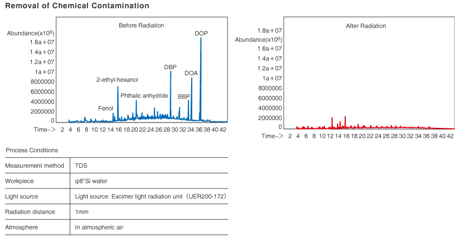 엑시머 등의 클리닝 효과는 조사되는 물질에 영향을 받기 때문에, 물질을 매칭하는 최적의 매개변수를 결정할 필요가 있습니다. 글래스 기판의 클리닝을 위한 매개변수는 참고용으로 주어집니다.