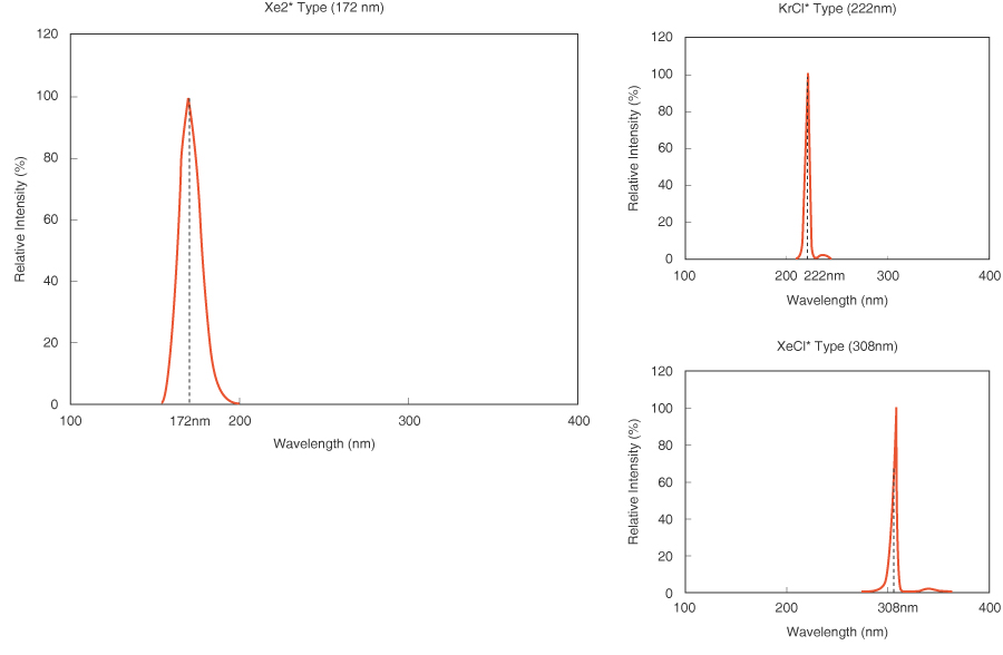 엑시머 방출은 정점 주변의 아주 좁은 영역에만 빛이 방출되는 싱글 정점 방출 파장이 특징입니다. 이것으로 화학 반응에 필요한 특정 UV 에너지만을 효율적으로 조사할 수 있습니다.