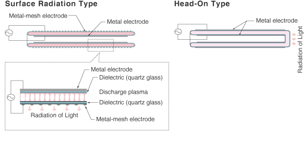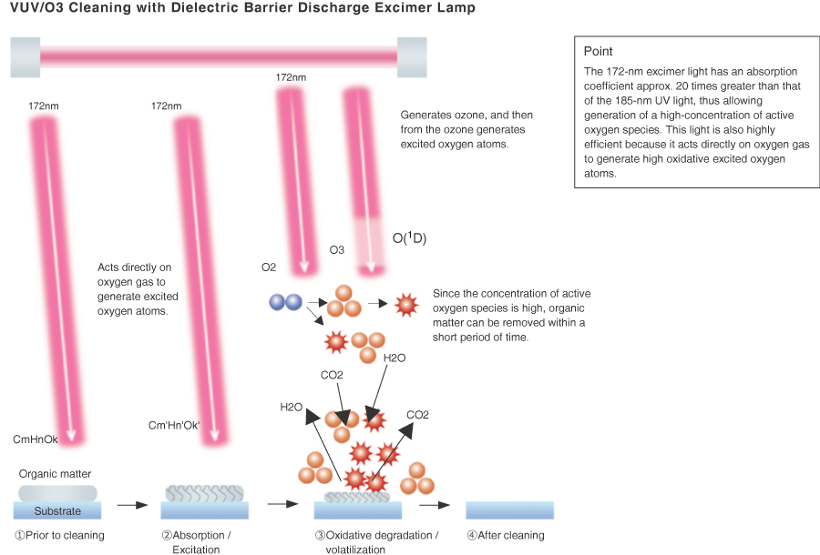 엑시머 VUV 광은 희가스 또는 희가스 수소 화합물을 함유한 램프에 의해 생성된 아주 높은 에너지의 빛입니다. 외부에서 높은 에너지의 전자를 희가스 또는 희가스 수소 화합물을 합유한 램프에 적용하면 강렬한 플라즈마 방출을 생성합니다(유전체 장벽 방전). 이 플라즈마는 높은 에너지의 전자를 함유하며 즉시 소멸되는 것이 특징입니다. 이 플라즈마 방출은 즉시 방출 가스(희가스) 의 원자를 엑시머(Xe) 상태로 여기 시킵니다(높은 에너지의 궤도 원자가 엑시머 여기 분자를 형성). 엑시머-특정 스펙트럼은 원자기 엑시머 상태에서 원래의 상태 (기저 상태) 로 돌아올 때 방출됩니다. 이 방출을 VUV 광이라고 부릅니다.