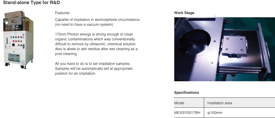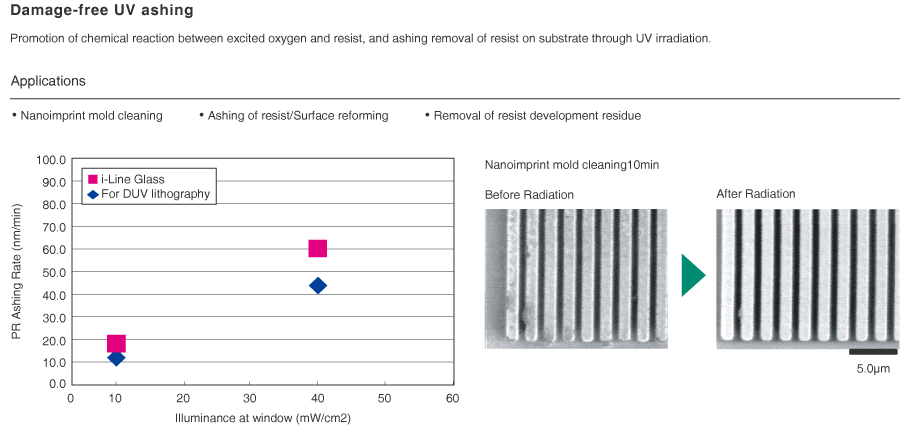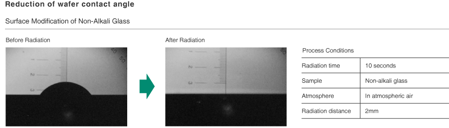 엑시머 등의 클리닝 효과는 조사되는 물질에 영향을 받기 때문에, 물질을 매칭하는 최적의 매개변수를 결정할 필요가 있습니다. 글래스 기판의 클리닝을 위한 매개변수는 참고용으로 주어집니다.