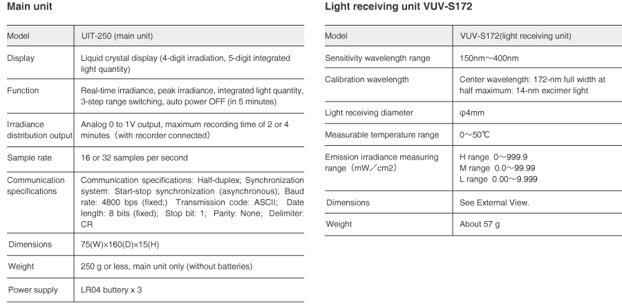 172nm 파장은 공기중에서 급속히 약해질 수 있습니다. 또한 더 긴 파장의 빛들은 172nm의 약 100분의 1의 강도를 방출합니다. 이 램프의 빛은 10cm 거리에서 부상 없이 볼 수는 있지만 램프가 켜진 상태에서 작업을 할 때에는 반드시 눈 보호 장구를 착용하십시오.