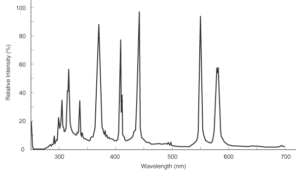 램프의 수은 증기는 강한 빛을 방출하며, 전구 속은 증기압이 대기압의 20배를 초과하며 약 섭씨 750도에 이릅니다.