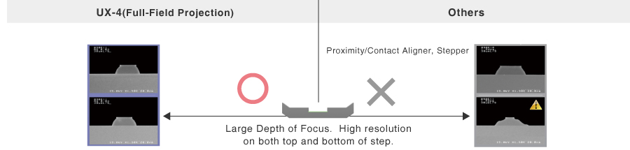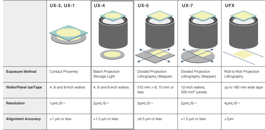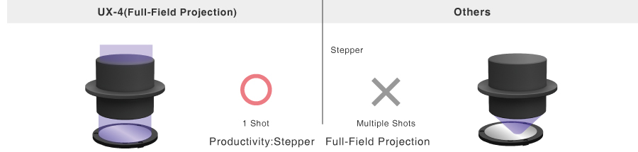 이 투영 정렬기는 우리의 특별한 넓은 영역 프로젝터 렌즈 기술, 광원 및 우시오가 오랜 동안 개발해온 광학 기술을 사용하고 있습니다. 마스크를 건드리지 않고 8인치 까지 웨이퍼의 원샷 노출을 제공합니다. 큰 피사계 심도는 비평면 웨이퍼의 적절한 노출을 가능하게 해 근접 정렬기로는 불가능했던 높은 생산성과 생산량을 달성합니다.