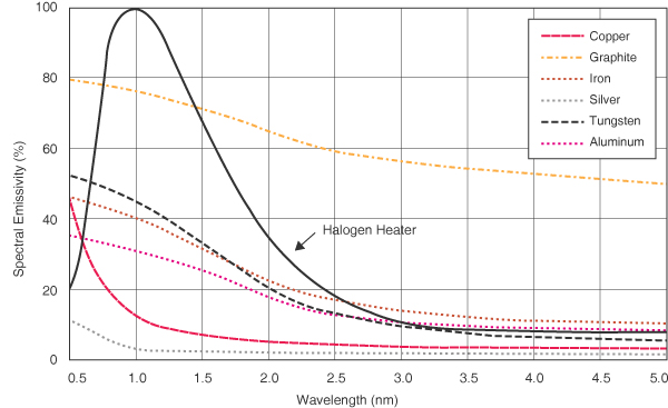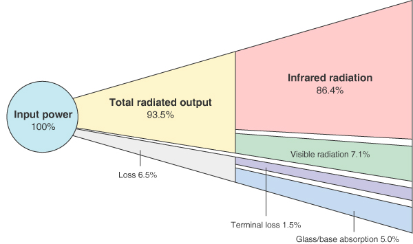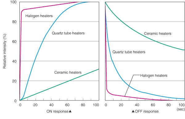 높은 효율의 램프 타입 복사열원에서는 입력 전원의 85% 이상이 적외선으로 변환됩니다.