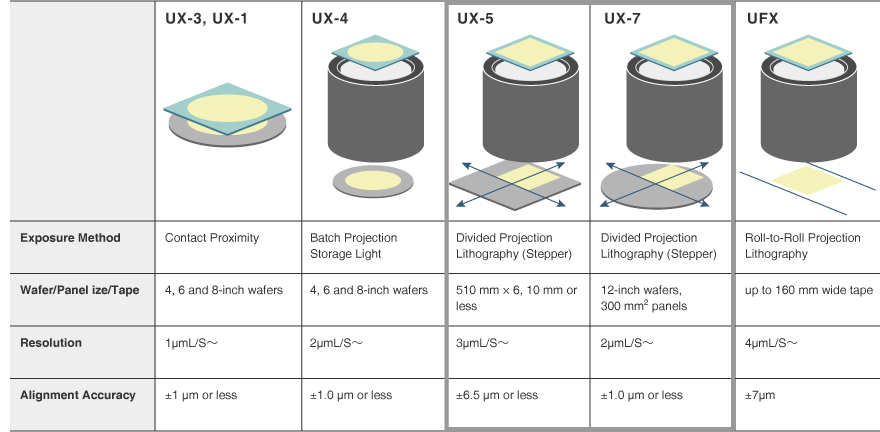 우시오는 서버와 PC 그리고 스마트폰 및 태블릿 PC와 같은 휴대 기기에 채택된 최신 패키징 어플리케이션용 특수 스테퍼를 제공합니다. 스테퍼는 패널 사이즈와 오랜 시간 동안 광원 및 광학 기술 분야에서의 전문성으로 함양된 우시오의 독점적인 넓은 영역 투영 렌즈 기술에 해당하는 단계를 사용하고 있는 패키지 기판을 위한 것입니다.