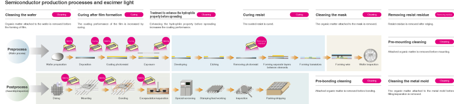 Ushio light and semiconductor manufacturing processes 노광 세정 개질 경화 및 접착 액정 디스플레이 기능성 소재 인쇄회로 기판 및 PKG 에너지 인쇄 반도체 생물학 및 화학 MEMS, 전자부품 다양한 반도체 웨이퍼 사이즈에 맞춰 다양한 제품들이 이용 가능합니다. Related products 엑시머 램프/엑시머 조사 유닛