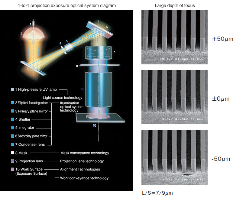 우시오는 마스크와의 비접촉으로 인해 마스크 손상이 없는 투영노광 방식에 착안해 종전에는 곤란했던 대형 면적ㆍ낮은 디스토션의 투영광학계를 개발하였습니다.