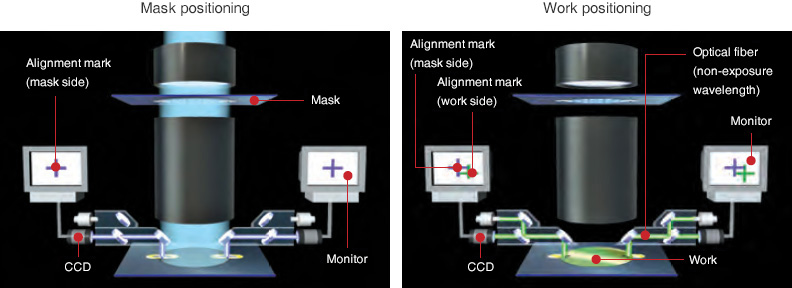 우시오의 대형 면적 투영노광장치는 독자적인 「TTL 비노광 파장 얼라인먼트」의 오토 얼라인먼트를 채용하고 있습니다. 이는 마스크와 워크의 얼라인먼트 마크를 개별적으로 검출해 각각을 화상처리를 통해 xy좌표 축 위에 고정시켜 위치를 맞추는 방식으로서 다음과 같은 특징이 있습니다.
